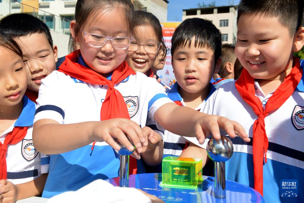 9月25日,四川省南充市南部县红岩子小学学生在体验趣味科普装置。